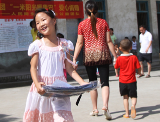 蔣家堰鎮(zhèn)中原小學(xué)謝娜小朋友領(lǐng)到捐贈書包高興回家