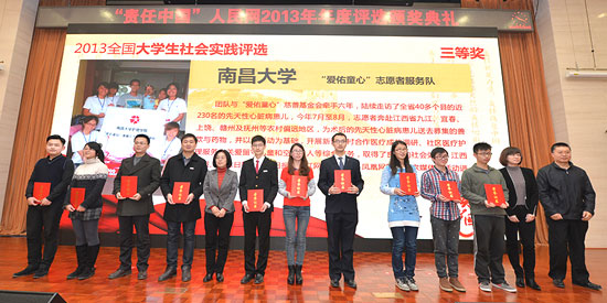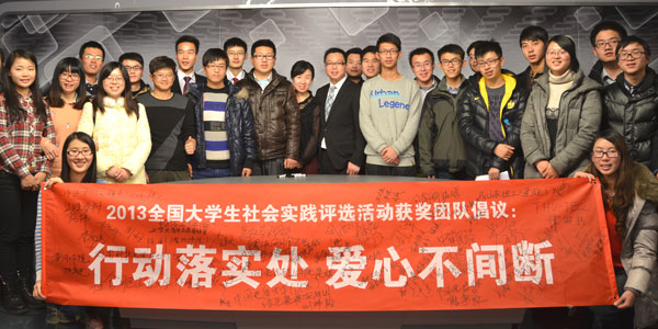 人民網(wǎng)北京1月15日電 (記者 張葳)1月15日,2013全國大學生社會實踐評選活動舉行頒獎和座談活動,獲獎大學生代表上百個團隊發(fā)表了倡議書,號召全國大學生們在社會實踐中做到“行動落實處,愛心不間斷”,經(jīng)常性、持續(xù)性地走進社會、服務基層,拒絕形式主義。
