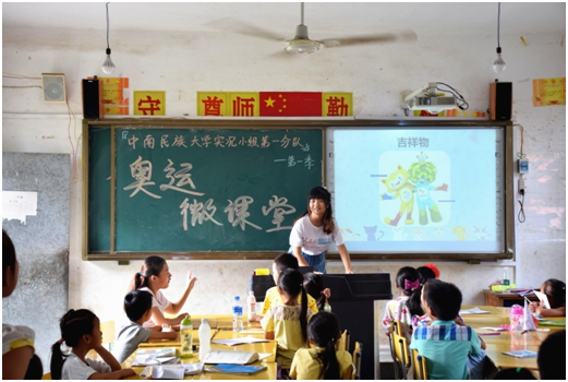 中南民族大學(xué)的實況小組志愿服務(wù)隊到貴州從江縣貫洞鎮(zhèn)龍圖小學(xué)支教,針對當(dāng)?shù)亓羰貎和狭艘惶镁实膴W運微課堂,并組織開展了龍圖小學(xué)趣味運動會,將奧運理論與實踐相結(jié)合,傳遞奧運精神。