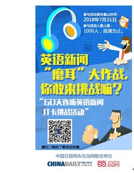 2018這個夏天,中國日報網(wǎng)攜手當(dāng)當(dāng)網(wǎng)推出首期“60天連聽英語新聞打卡達人活動”,你不僅能通過中國日報網(wǎng)外籍專家的純正英音、美音了解每天世界上的精彩趣聞,還可以考驗自己的毅力和自律性。60個工作日,三個月的時間,看似很短,但是你的努力,時間看得到!跟上我們這60天的步伐,相信您的英語能力會日益精進。