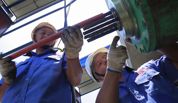 徐露平(右)研制的“鋼絞線自動(dòng)穿束機(jī)”