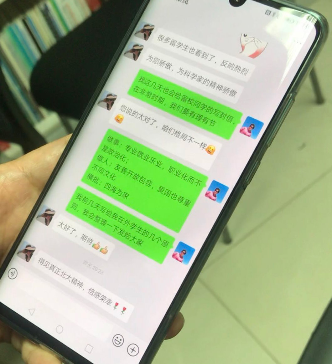 (張海霞在師生聯(lián)絡群中,發(fā)表了一段話:做事:專業(yè)敬業(yè)樂業(yè),職業(yè)化而不是政治化;做人:友善開放包容,愛國也尊重不同文化;橫批:四海為家 崔澤昊/攝)