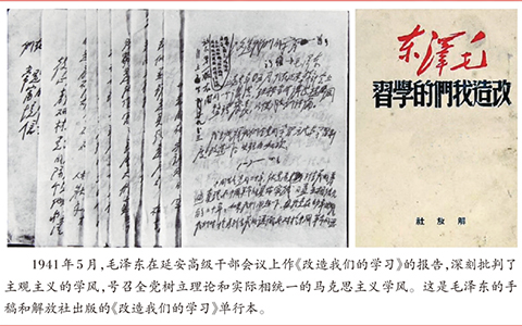 延安整風(fēng)運(yùn)動(dòng)以反對(duì)主觀主義、宗派主義、黨八股,樹(shù)立馬克思主義作風(fēng)為主要內(nèi)容。而鑒于深重的思想之弊和慘痛的實(shí)踐教訓(xùn),反對(duì)主觀主義以整頓學(xué)風(fēng),成為開(kāi)展整風(fēng)運(yùn)動(dòng)的關(guān)鍵。整風(fēng)運(yùn)動(dòng)開(kāi)展后,毛澤東就緊緊抓住思想方法和作風(fēng)問(wèn)題不放。他在給中央研究組同志的信中指出:學(xué)習(xí)理論要“以研究思想方法論為主”。破除錯(cuò)誤的思想方法,暢行正確的思想作風(fēng),最重要的就是要遵循實(shí)事求是的思想路線,做到理論聯(lián)系實(shí)際!皩(shí)事求是”這個(gè)詞,并非毛澤東首創(chuàng),但把“實(shí)事求是”上升到黨的思想路線的高度,則是毛澤東的功勞。毛澤東強(qiáng)調(diào),“要分清創(chuàng)造性的馬克思主義和教條式的馬克思主義”,“宣傳創(chuàng)造性的馬克思主義”,“使中國(guó)革命豐富的實(shí)際馬克思主義化”。不能從理論上來(lái)思考中國(guó)革命實(shí)踐的人,是不能妄稱為馬克思主義理論家的。只有從客觀實(shí)際中概括出而又在客觀實(shí)際中得到證明的理論,才稱得起我們所講的理論。