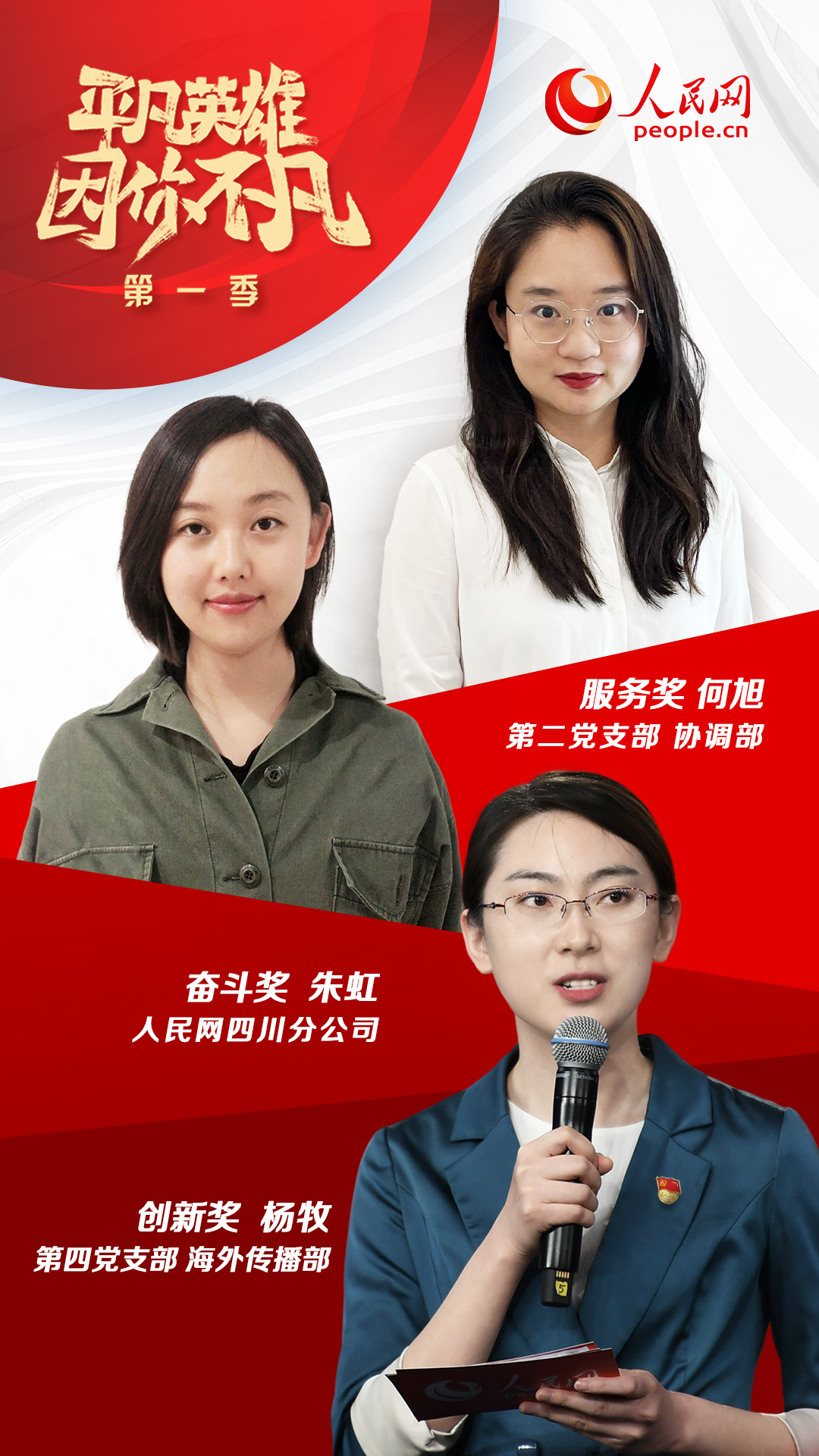 經(jīng)過激烈比拼,第二黨支部何旭(協(xié)調(diào)部)、第四黨支部楊牧(海外傳播部)、四川分公司朱虹三位同志最終分獲“平凡英雄”服務(wù)獎(jiǎng)、創(chuàng)新獎(jiǎng)和奮斗獎(jiǎng)。同時(shí),第七黨支部董曉偉(網(wǎng)絡(luò)評(píng)論部)、第十一黨支部厲姣(紀(jì)檢監(jiān)察室)、第十三黨支部鄭瀟瀟(移動(dòng)內(nèi)容部)、第二十一黨支部張利娟(人民視聽科技有限公司)、安徽分公司李希、山西分公司馬瑩等六位同志獲得“平凡英雄”入圍獎(jiǎng)。